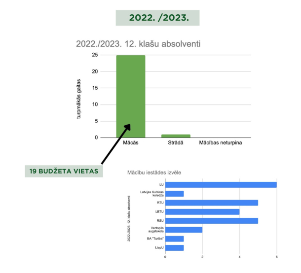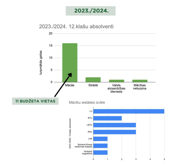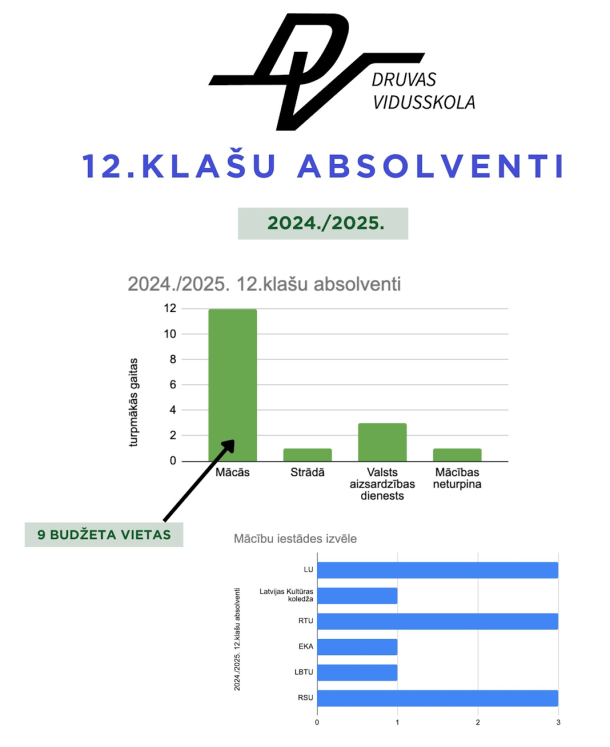 Infografika par Druvas vidusskolas 12.klašu absolventu tālākajām izglītibas gaitām.