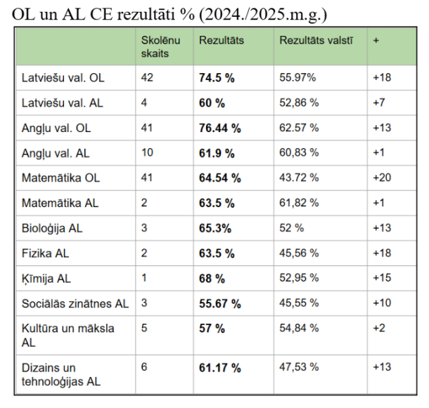 Druvas vidusskolas vidējais sniegums valsts pārbaudes darbos pārsniedz valsts vidējos rādītājus aptuveni par 10–20 procentiem, kas norāda, ka skolas mācību process ir sistemātisks, kvalitatīvi organizēts un efektīvs. Skolēni sasniedz augstākus mācību rezultātus nekā valstī vidēji, kas apliecina pedagogu profesionālo kompetenci un mācību satura atbilstību skolēnu vajadzībām.