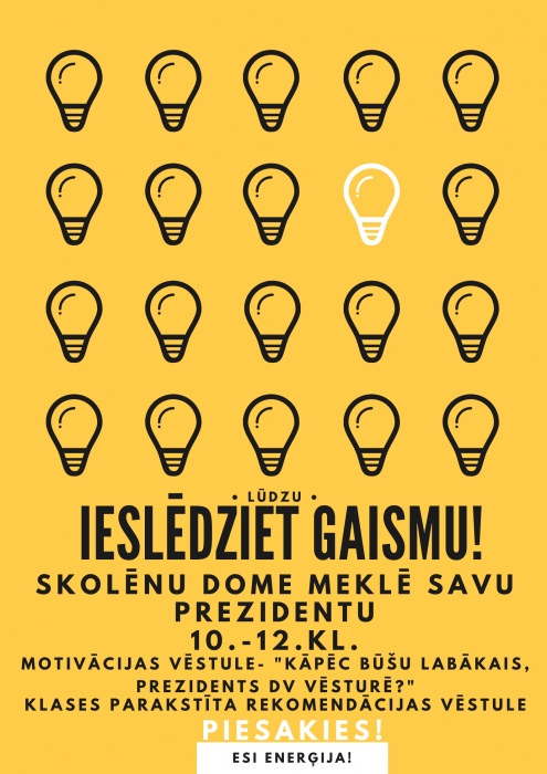 Skolas aktīvie un enerģiskie prāti, radošās prsonības un aizrautīgie skolēni aicināti pievienoties skolēnu domei! Pirmā tikšanās 2021.gada 22.decembrī plkst.16:00 !